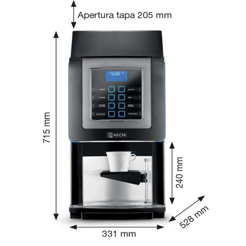 Diseño robusto Un dispensador súper automático de bebidas calientes con componentes de la más alta calidad para soportar grandes cargas de trabajo y área de entrega de acero inoxidable. Una elegante 'iluminación ambiental' ilumina tanto la parte frontal como los laterales. Interfaz de usuario simple Panel de selección retroiluminado y sensible al tacto y una gran pantalla gráfica Posibilidad de utilizar taza o jarra propia (hasta 24 cm). Tecnología a tus órdenes Compacto, fácil de usar y extraordinariamente versátil. Una gama complementaria de accesorios está disponible para satisfacer las necesidades de cada cliente.