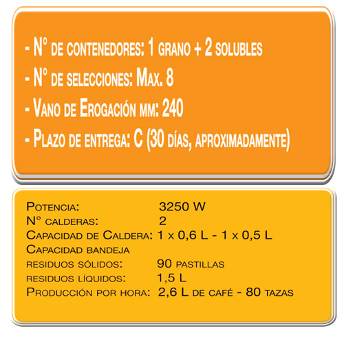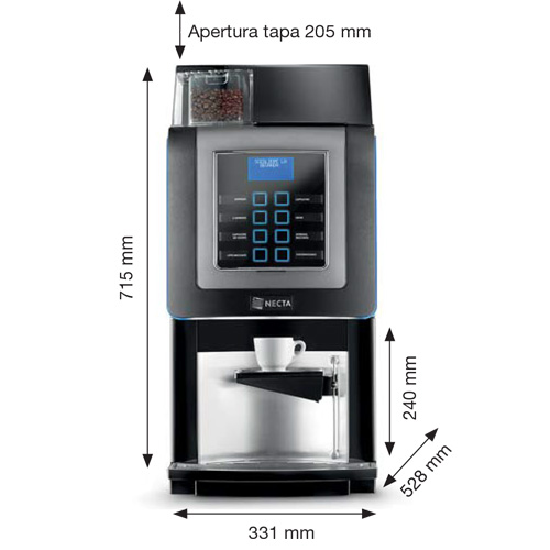Diseño robusto Un dispensador súper automático de bebidas calientes con componentes de la más alta calidad para soportar grandes cargas de trabajo y área de entrega de acero inoxidable. Una elegante 'iluminación ambiental' ilumina tanto la parte frontal como los laterales. Interfaz de usuario simple Panel de selección retroiluminado y sensible al tacto y una gran pantalla gráfica Posibilidad de utilizar taza o jarra propia (hasta 24 cm). Tecnología a tus órdenes Compacto, fácil de usar y extraordinariamente versátil. Una gama complementaria de accesorios está disponible para satisfacer las necesidades de cada cliente.