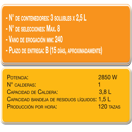 Diseño robusto Un dispensador súper automático de bebidas calientes con componentes de la más alta calidad para soportar grandes cargas de trabajo y área de entrega de acero inoxidable. Una elegante 'iluminación ambiental' ilumina tanto la parte frontal como los laterales. Interfaz de usuario simple Panel de selección retroiluminado y sensible al tacto y una gran pantalla gráfica Posibilidad de utilizar taza o jarra propia (hasta 24 cm). Tecnología a tus órdenes Compacto, fácil de usar y extraordinariamente versátil. Una gama complementaria de accesorios está disponible para satisfacer las necesidades de cada cliente.