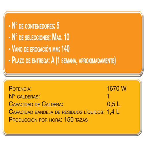 Innovaciones técnicas Máquina de café patentada Z4000 y tecnología instantánea Freemix. Caldera compacta de espresso con capacidad de 600 cc para un alto rendimiento. Recipientes modulares para productos instantáneos y bebidas de alta calidad con tiempos de entrega optimizados. Diseño e interfaz de usuario. Diseño elegante y atractivo con un precioso marco cromado alrededor del área de selección. Botones pulsadores cromados con área de selección iluminada por LED bien legible. Paneles laterales de aluminio cepillado mate. Posibilidad de iluminación LED en la estación de taza más opción de sensor de taza y soporte de taza de acero inoxidable Electrónica y mantenimiento. Electrónica mejorada de 16 bits con 4 MB de memoria flash. Gran pantalla gráfica de 128 X 64 píxeles con posibilidad de mostrar animaciones simples. Configuración de la configuración de la máquina a través del software de gestión GIGA y codificación por colores de los principales componentes internos para un fácil mantenimiento.