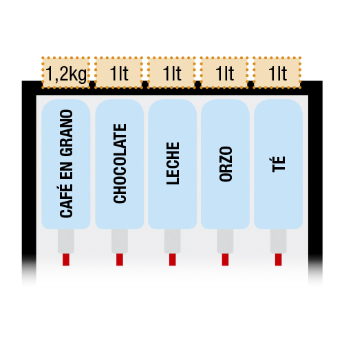 Diseño elegante con un marco cromado rodeando el área de selecciones Ilumunación Led en la etiquetas de selección Paneles laterales personalizables Tolva para granos de café transparente