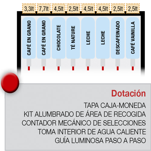 Electrónica y mantenimientoElectrónica de 16 bits con 4 mb de memoria Flash EpromAmplio display gráfico LCD con posibilidad de proyectar imágenesCódigo de colores de los componentes para facilitar la limpieza y mantenimientoModo ahorro de energía programableNueva torre de vasos transparente que facilita el control del stock