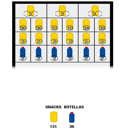 Posibilidad de ofrecer aperitivos, latas y botellas. Cuando se deposita con el modelo H&C, ofrece un servicio perfecto para un descanso completo. Fotocélula en el contenedor de entrega. Minisnakky se beneficia de una huella pequeña para la ubicación con disponibilidad de espacio reducido. La gran ventana con iluminación LED permite una excelente vista del producto. La interfaz de usuario y el sistema de pago se ajustan en la máquina maestra de H&C.